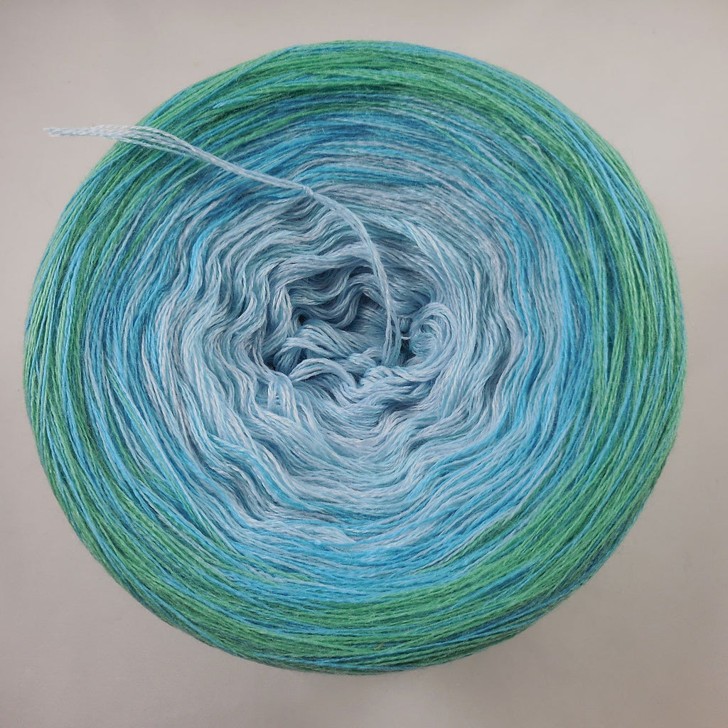 Garnet er oprullet, fra fabrikken på 2 forskellige måder. Derfor kan farveskiftet være omvendt på nogle ruller, det har ingen praktisk betydning, da man selv vælger om man vil starte fra midten eller ude fra. Resultatet er det samme. Begge typer ruller kan man se på billederne.